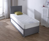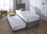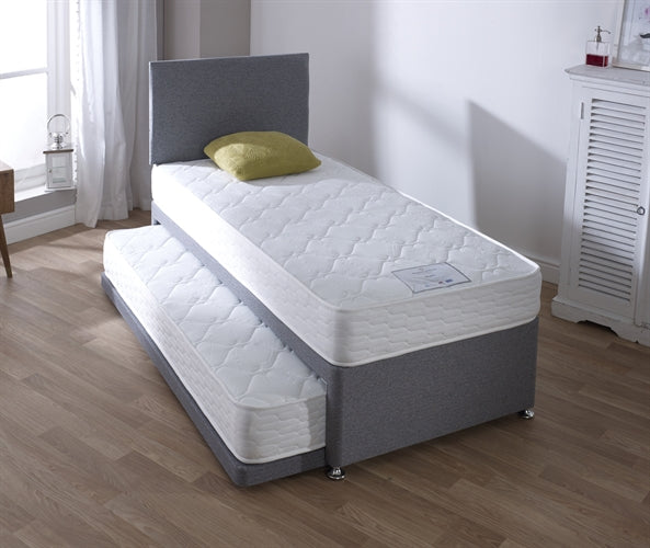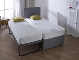 Ideal for use where space is limited, the ever popular Guest Bed is an ideal choice. The 3’ x 6’3” single neatly houses a separate 2’6” x 5’9” under bed, which can be easily pulled out and raised to the same height (see pic). This exceptional value model is supplied in an attractive micro-quilted damask cover, with the base and optional headboard available in a wide choice of attractive covers.