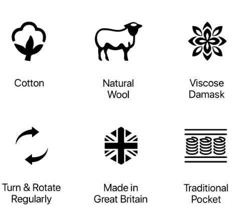 Handcrafted in the UK, this mattress combines traditional artistry with modern comfort. Featuring 1,500 individually nested pocket springs, it delivers exceptional support and responsive comfort throughout the night. Luxurious damask fabric envelopes layers of premium natural wool and cotton, chosen for their breathability and softness. Every detail, from the hand-stitched borders and intricate embroidery to the sturdy turning handles, reflects superior craftsmanship. The result is a beautifully balanced mattress that offers lasting comfort, timeless elegance, and a truly indulgent night’s sleep.