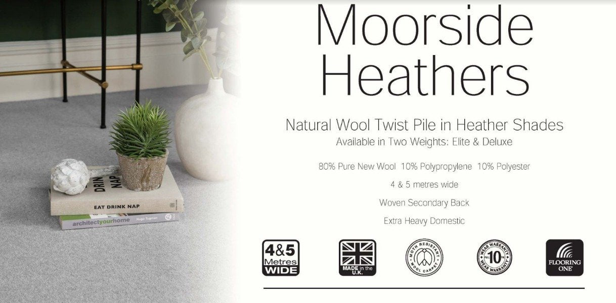 A classic British Wool Twist pile carpet in natural heather shades. Tufted on tenth gauge machinery to create a fine, dense pile surface. Our Moorside Heather Twist standard sample book comes in the "Elite" weight, but this range is also available in the heavier “Deluxe” quality with a feeler sample available in store.