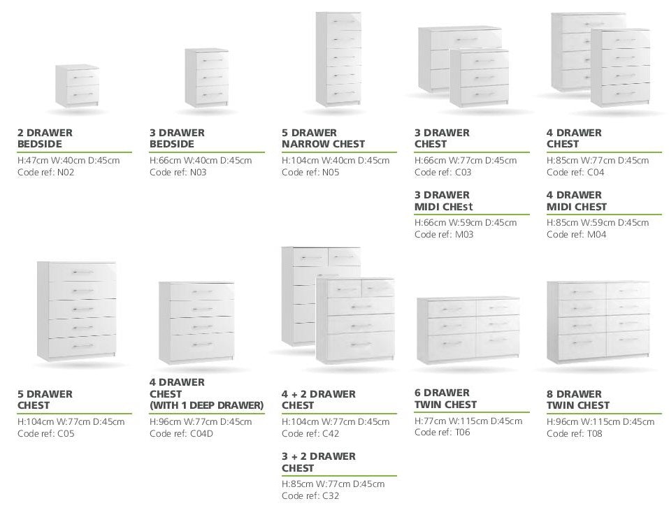 The Roma gloss range is the perfect range to dress modern bedrooms, providing a stylish attitude that captures the light with it’s smooth surface then reflects it back for a stunning effect. You can indulge in your artistic flare by introducing a fusion of colours into your personal space. Available in White Gloss or Light Grey Gloss. Wardrobes available from 1 door wide to 6 doors wide.